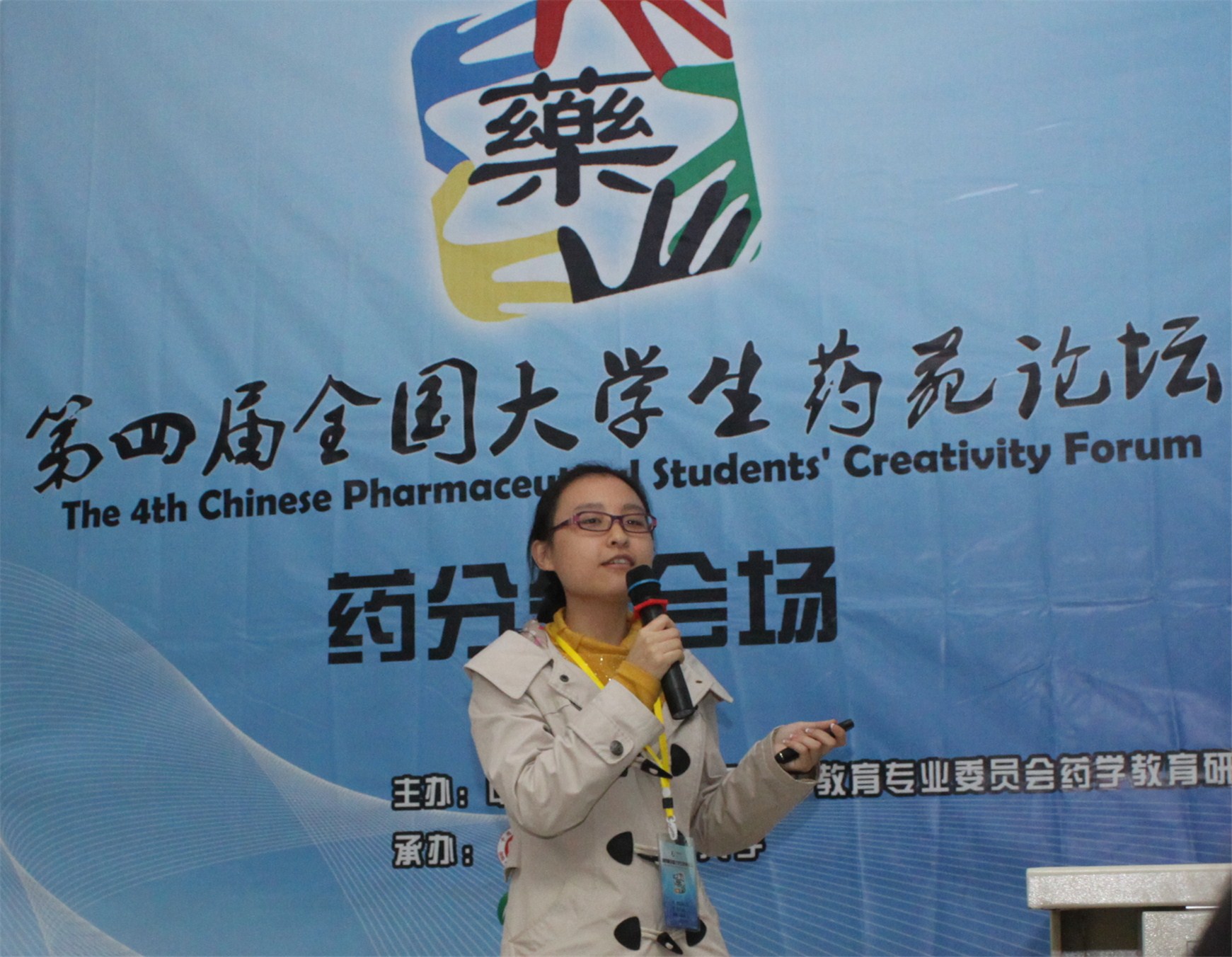 会上,先声药业集团高级副总裁殷晓进、中国药科大学孔令义教授以及台湾大学林淑文博士分别为师生代表介绍了中国制药企业创新药物研发体系建设、天然药物化学研究实例以及抗真菌药物伏立康唑的临床药学研究。此外,台湾药学生联合会主席李懿轩为与会人员介绍了台湾药学生的培养。学生成果交流部分采用了展板交流及成果汇报两种形式,展示了全国各地药学精英们的创新成果。我校学生代表叶亚婧汇报了“超声酶法提取红藤中有效成分的工艺及提取物抗氧化性研究”项目的研究成果,周雅迪汇报了“基于Multitarget-QSAR和化学基因组学的配体-蛋白相互作用预测方法研究”项目的研究进展,均荣获“第四届全国大学生药苑论坛创新成果三等奖”。