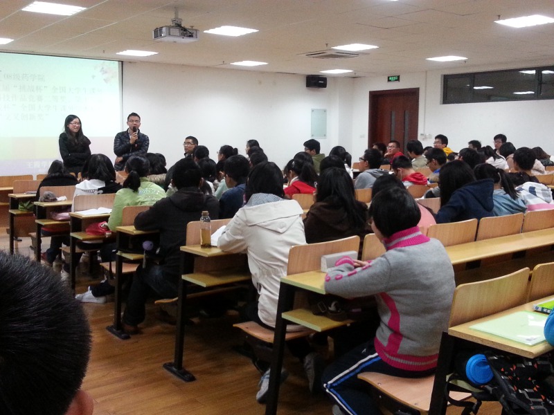 为让同学们对科创活动有更多的了解和接触,药学院于11月22日,邀请在第十三届“挑战杯”全国大学生课外学术科技作品竞赛中获奖团队负责人陈显军、王霞来奉贤,与本科生进行交流,分享在科创方面的经验。