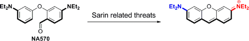 荧光信号的开关机制是探针的设计关键,杨有军副教授课题组一直致力于开发新的荧光探针调控机制,即让待测底物触发一个级联反应,并在检测体系中原位生成荧光染料的推拉电子共轭骨架,他将该方法命名为“共价组装法”。相比于目前应用广泛的光物理调控思路,或者其它经典的对染料进行化学修饰的探针设计方法,“共价组装法”的一个优点是此类探针给出的是一个从零背景增强的荧光信号,检测的灵敏性极高。基于该思路,杨有军副教授最近设计了一个可检测沙林类似物的小分子荧光探针,相关结果“A concise colorimetric and fluorimetric probe for sarin related threats designed via the “covalent-assembly” approach”发表在J. Am. Chem. Soc. (http://pubs.acs.org/doi/abs/10.1021/ja502945q)。