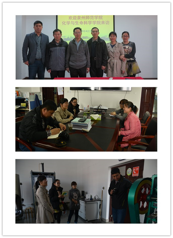 近日,泉州师范学院化学与生命科学学院制药工程专业一行三人在系主任谢晓兰老师带领下来药学院学习调研,药学院副院长唐赟、制药工程系系主任任福正、制药工程系虞心红教授三人对其来访表示热烈的欢迎。