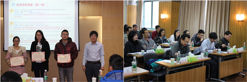 演讲报告在一片轻松欢快的氛围中开始,实验室学术带头人唐赟教授、刘建文教授、李剑教授及药学院优秀青年教师杨友教授、何薇薇副教授担任现场评委,来自实验室各课题组的12位同学参与了演讲评选奖项的角逐。参赛学生从各自的研究领域出发,以独到的视野、深入浅出地介绍了自己的科研成果,精彩的报告不时赢得同学们热烈的掌声。
