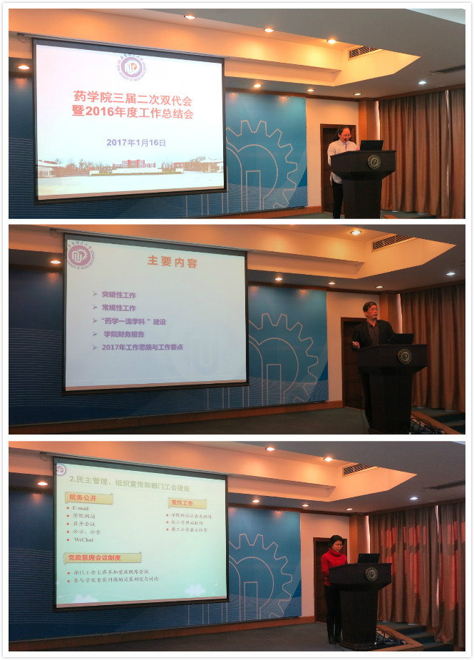 1月16日,药学院在逸夫演讲厅召开学院三届二次双代会暨2016年度工作总结研讨会。会议由学院党委书记王喆主持,药学院全体教师出席。