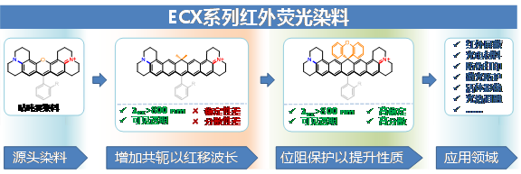 经测试发现,此类染料在可见光范围基本没有吸收,仅在红外光谱区间(780-880 nm)有强烈吸收,因此其溶液成无色透明。ECX系列染料有优异的化学稳定性及光稳定性。ECX染料分子之间不相互聚集,因此具有很好的分散性,并且其光谱性质几乎不随溶剂改变而改变(低溶剂化变色效应)。这些性质使得EC系列染料在材料领域具有较大的应用潜力。另外,EC系列染料在920nm处有较强的荧光发射,在生物医学影像及诊疗中有潜在应用。