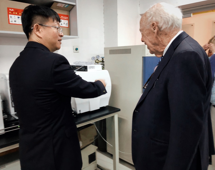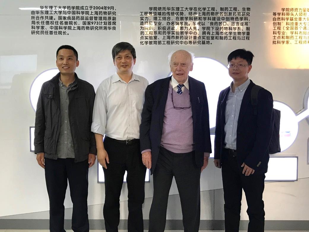 沃森一行参观了华东理工大学生物反应器工程国家重点实验室,并考察了杨弋的实验室与研究团队,听取了杨弋关于利用先进细胞氧化还原代谢荧光探针进行抗癌药物发现研究汇报。近些年来,杨弋团队在细胞代谢荧光探针与成像领域取得了系列重要研究成果,得到包括沃森在内的国际同行认可,其发明的Frex、SoNar、iNap等系列细胞代谢探针被Nature Methods等权威期刊评论为生物氧化还原领域的“变革性(revolutionary)”技术。在这些成果的基础上,杨弋和赵玉政已经通过筛选数万种小分子化合物,找到了可以特异性强烈刺激癌细胞产生大量活性氧自由基的候选药物,并在细胞与动物模型上实现了对多种肿瘤细胞的选择性杀伤。沃森与杨弋对利用活性氧这一癌症治疗策略的相关科学问题与合作事宜进行了详细研讨。杨弋还向沃森介绍了以细胞代谢研究为特色的华东理工大学光遗传学与合成生物学交叉学科研究中心建设的情况。在座的冷泉港亚洲CEO季茂业博士、药学院院长宋恭华教授、药学院赵玉政也参与了讨论。最后,沃森与在场的研究生及青年教师们亲切合影,勉励大家努力工作,争取早日攻克癌症。