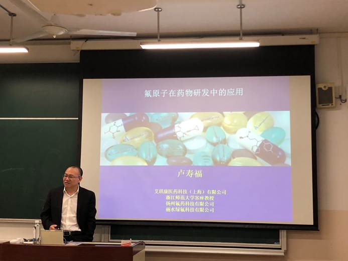 应药学院邀请,上海艾琪康医药科技有限公司总裁卢寿福博士于10月25日15:30在七教101为药学院和化学院师生做了题为“氟原子在药物研发中的应用”的学术报告。报告会由邓卫平教授主持。