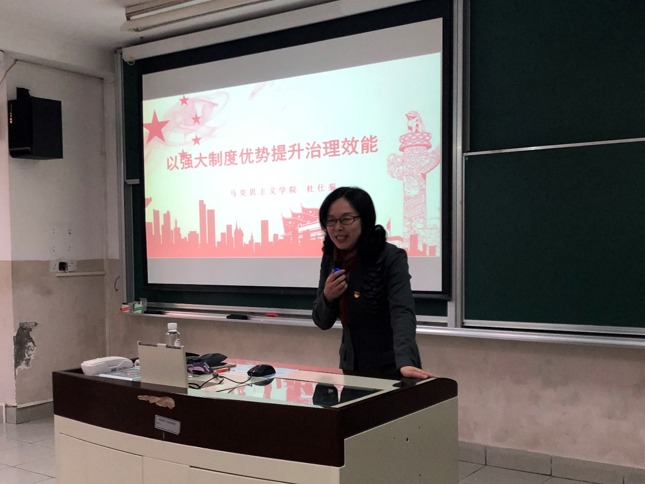 杜仕菊从“十九届四中全会的主题、背景和成果”、“中国特色社会主义的制度优势”、“中国特色社会主义制度和治理体系的历史逻辑、理论逻辑和实践逻辑”和“发扬制度优势,提升治理效能”四个方面,旁征博引,全面宣讲了《中共中央关于坚持和完善中国特色社会主义制度、推进国家治理体系和治理能力现代化若干重大问题的决定》,精辟论述了我国国家制度和国家治理体系应该“坚持和巩固什么、完善和发展什么”这个重大政治问题。杜仕菊号召大家为坚持和完善中国特色社会主义制度、推进国家治理体系和治理能力现代化,实现“两个一百年”奋斗目标、实现中华民族伟大复兴的中国梦而努力奋斗!