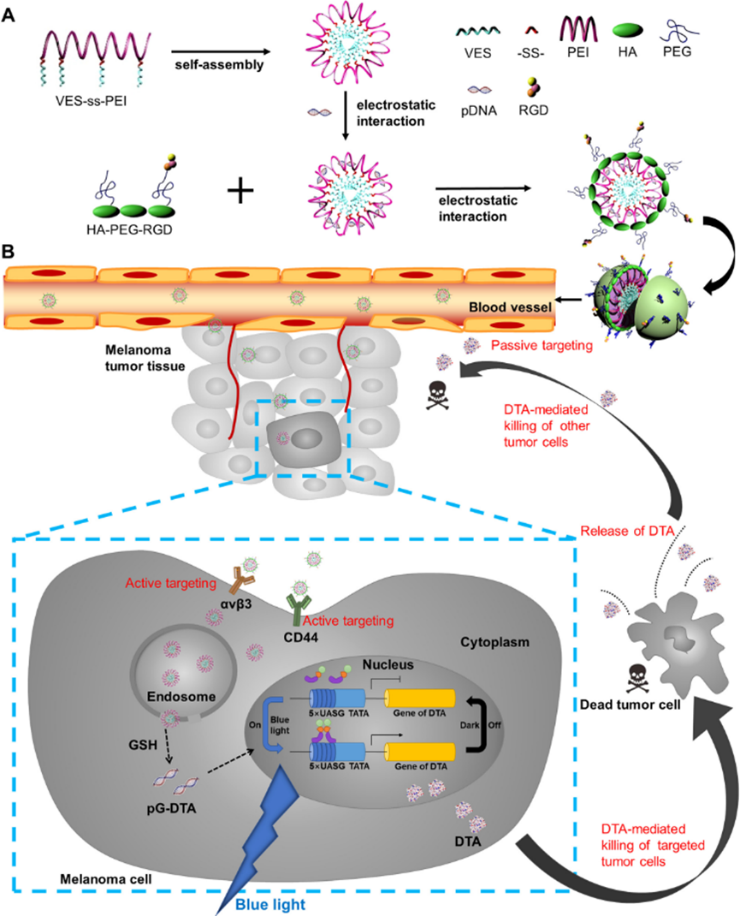 最近,我校药学院高峰教授和杨弋教授团队合作开发了一种新型纳米递药系统,能够响应肿瘤微环境智能释药,联合基因光控表达系统,实现了白喉毒素A片段(DTA)光控与靶向治疗黑色素瘤和乳腺癌。相关成果发表在医学杂志《Journal of Controlled Release》与《Acta Pharmaceutica Sinica B》上。