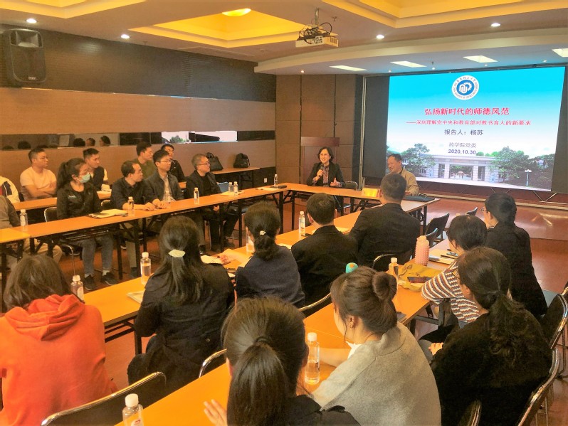 为深入学习贯彻中共中央、国务院和教育部关于进一步加强师德师风建设的相关文件精神,药学院党委特邀请杨苏教授为教师作“弘扬新时代的师德风范——深刻理解党中央和教育部对教书育人的新要求“的教职工理论学习专题报告会。院党委委员、领导班子、系所中心负责人、导师组组长、班导师、辅导员、新教工及教师代表等进行了现场学习,其他教职工开展了在线视频学习。报告会由学院党委书记张青主持。
