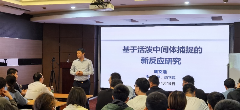 胡文浩的研究方向主要集中在有机合成方法学、新药研发和药物合成工艺,尤其是在基于活泼中间体捕捉的多组分新反应研究领域取得了一系列创新性研究成果。在报告会上,胡文浩详细介绍了其课题组基于捕捉卡宾活性中间体的多组分新反应的研究和展望,并对反应机理进行了深入的探讨。报告内容丰富精彩,深入系统的研究工作让在场的师生受益匪浅。报告结束之后,胡文浩还与在座师生们进行了热烈的互动交流。