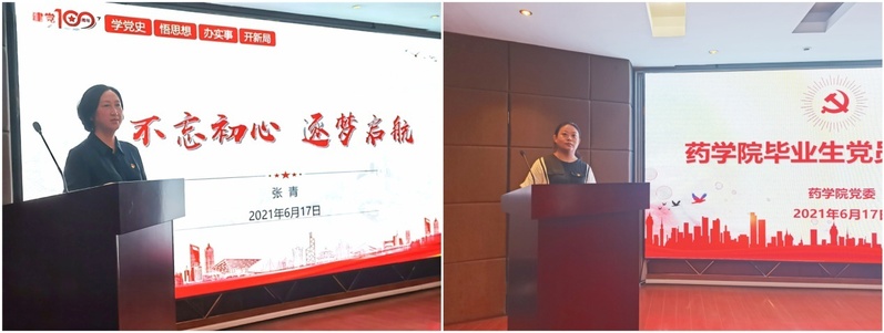 2021年6月17日,药学院开展毕业生党员离校教育,旨在进一步提高毕业生党员党性修养,增强使命担当,进一步推动学院党史学习教育向纵深发展,以优异成绩迎接中国共产党成立100周年。药学院党委书记张青出席并为毕业班党员开设专题党课,学院专职组织员、研究生辅导员、毕业班辅导员及毕业生党员等参加了会议。会议由药学院党委副书记王越主持。
