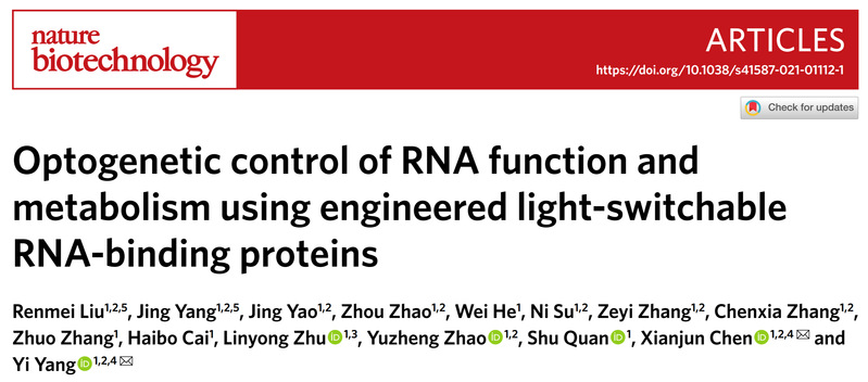近日,我校生物反应器工程国家重点实验室、光遗传学与合成生物学交叉学科研究中心、药学院、上海市细胞代谢光遗传学技术前沿科学研究基地杨弋教授团队在RNA光遗传学控制技术研究中取得突破性进展,在国际权威学术期刊《自然—生物技术》(Nature Biotechnology)以长篇论文(article)形式在线发表题为“Optogenetic control of RNA function and metabolism using engineered light-switchable RNA-binding proteins” 的研究文章。