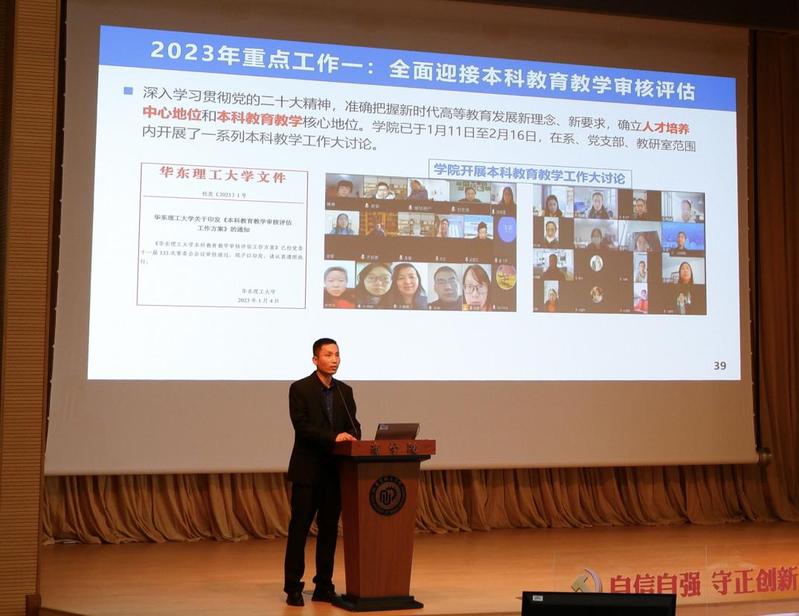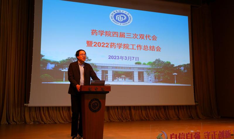 药学院副院长(主持工作)赵玉政教授代表学院行政班子做了药学院2022年度行政工作报告,报告从师资队伍、人才培养、学科建设、科学研究、国际交流与合作等方面,全面回顾了2020年以来药学院取得的突出成绩,着重分析了学院目前面临的机遇和挑战,并对2023年重点工作任务作了部署。在2023年的工作中,药学院将以本科教育教学审核评估,奉贤校区生物医药大楼、实验动物中心和现代产业学院建设为契机,持续推进学科建设、加强师资队伍建设、提高人才培养质量、优化实验室布局、提升产教融合能力、促进国际交流合作,推动学院事业发展再上新台阶。