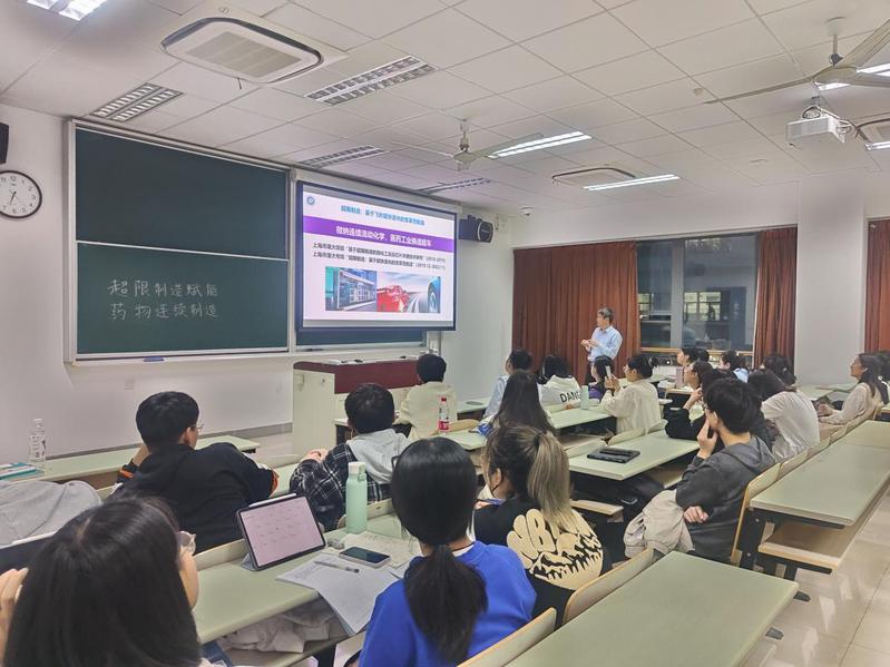 朱维平教授结合当前医药科技大环境,为同学们讲解了“超限制造”的含义,围绕药物连续流动合成及相关技术进行交流,并介绍了其课题组通过连续流动合成方法开发的全新药物合成工艺,生动地向同学们讲述了科技创新为生活带来的影响,结合自身经历对同学们未来学业、科研、职业规划等方面给出建议。