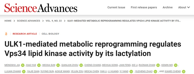 202363日,我校药学院、生物反应器工程国家重点实验室、光遗传学与合成生物学交叉学科研究中心程侠卫/赵玉政/杨弋团队在细胞自噬的调控机制方面取得最新研究进展,在国际学术期刊《Science Advances》发表题为“ULK1-mediated metabolic reprogramming regulates Vps34 lipid kinase activity by its lactylation”的研究文章。