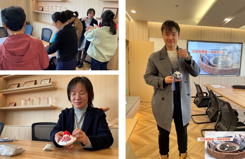 听完讲解后,大家分别挑选了助眠、防感冒和怡神解压的中药材,放入香囊之中,然后仔细地制作起来,一个个饱满又精致的中药香囊呈现在大家眼前,整个房间都弥漫着清幽的香气。通过本次活动,让大家体验到了制作香囊的乐趣,普及了传统中医药知识,感受到了中药的魅力,更深入地了解了中医药文化的内涵,传播了健康生活理念。