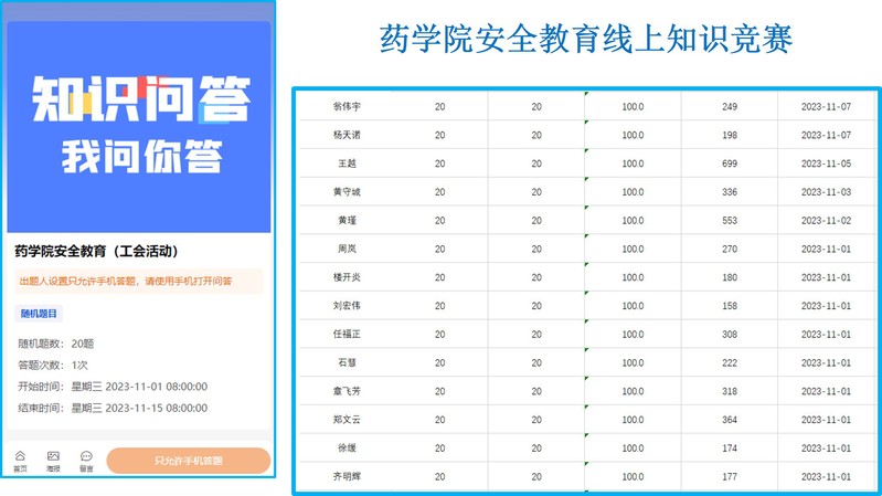 为进一步提高广大教师的实验安全意识,营造良好的安全氛围,11月1至15日药学院工会举办了“药学院安全教育线上知识竞赛”活动。本次活动共计75人参与答题,其中100分有29人,95分有23人,90分有16人,85分有6人,80分1人。