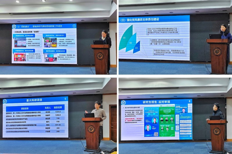 会上,药学院党委副书记王越、陈莉丽,副院长邵旭升、马磊和张敏分别就自己分管的学生思政工作、党建和纪委工作、科研和实验室安全、研究生教育、本科教学和校友等工作取得的成绩、面临的问题及2024年工作重点向全院教师进行了汇报。