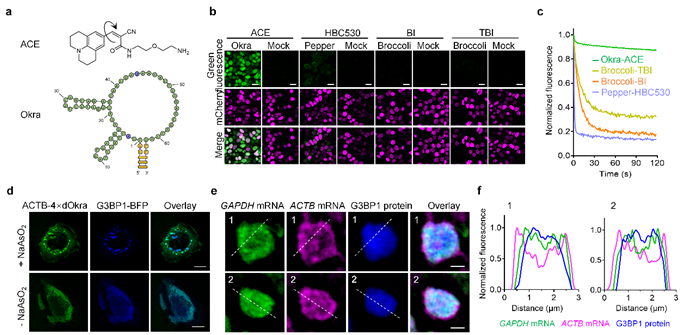 针对上述技术挑战,研究团队创新发展了具有高亮度和高稳定性的新型绿色荧光RNA,称为Okra505Okra505Okra RNA适配体和新型荧光团分子ACE构成,Okra可以以纳摩尔级的高亲和力结合ACE,并显著激活其产生明亮的绿色荧光。Okra505具有低Mg2+依赖性、高温度稳定性、高pH耐受性、不含有G-四链体等优点。进一步研究结果表明,Okra505在活细胞成像亮度以及光稳定性方面相较于前人报道的绿色荧光RNA提升了1-2个数量级,可实现细菌和哺乳动物细胞内低丰度mRNA的高亮度和低背景成像。受益于高亮度和高光稳定性的优点,Okra505可以被用于实时监测哺乳动物细胞内应激颗粒(Stress granulesSGs)的形成以及解聚过程,以及探究ATP能量分子对应激颗粒动力学过程的影响。通过与Pepper620联合实用,Okra505还可被用于应激颗粒内不同mRNA分布的结构光照明超分辨成像(SIM),揭示了不同mRNA在颗粒中分布的异质性和不均一性。