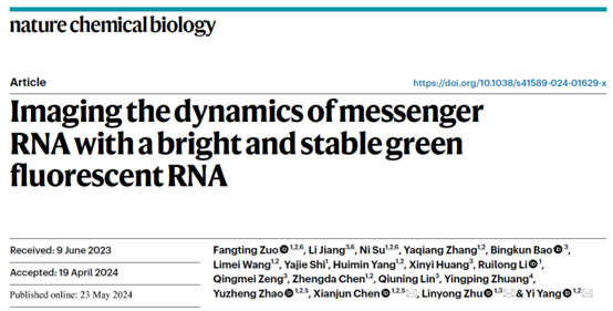 近日,我校药学院、生物反应器工程国家重点实验室、光遗传学与合成生物学交叉学科研究中心杨弋、朱麟勇、陈显军教授组成的研究团队在活细胞RNA成像技术研究中取得突破性进展,在国际著名学术期刊《自然—化学生物学》(Nature Chemical Biology)以长篇论文(article)形式在线发表题为“Imaging the dynamics of messenger RNA with a bright and stable green fluorescent RNA”的研究论文。