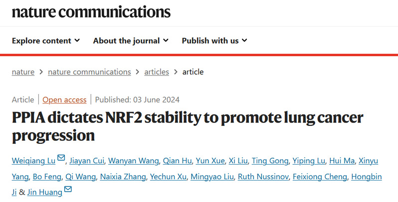 近日,我校药学院黄瑾课题组在国际权威学术期刊Nature Communications发表题为“PPIA dictates NRF2 stability to promote lung cancer progression”的研究论文,报道了PPIA是维持NRF2蛋白稳定性的关键伴侣蛋白,破坏PPIA/NRF2互作可导致NRF2蛋白水平下调,证明了PPIA/NRF2互作具有明确的可靶向性,是潜在的抗肺癌药物新靶标。