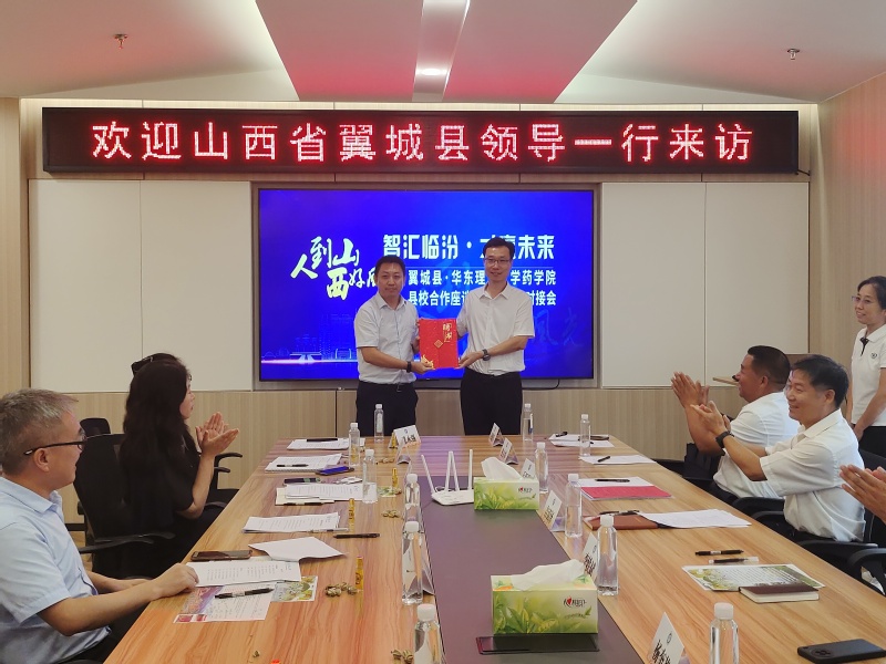 吉清泽表达了与药学院共同推进校地产学研合作的愿望,希望此行能加强与学院相关领域教师的交流与合作,助力翼城县科技产业发展。吉清泽向药学院赠送了翼城县当地非遗文化特产“唐尧闹春图”,祝贺学院成立20周年。他还向药学院副教授张永强颁发了“翼城县招才引智大使”证书,以表彰其在促进校地合作方面的贡献。