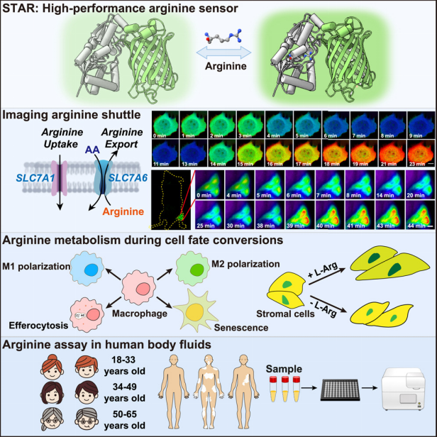 2024年10月15日,我校药学院、生物反应器工程国家重点实验室、上海市细胞代谢光遗传学技术前沿科学研究基地赵玉政教授、杨弋教授以及上海交通大学医学院附属第九人民医院方伟副主任医师合作在Cell子刊Cell Metabolism发表题为“Lighting up arginine metabolism reveals its functional diversity in physiology and pathology”的技术长文。该研究报道一个高性能、遗传编码的精氨酸荧光探针“STAR”,成功实现在单细胞及活体水平对精氨酸代谢的特异、灵敏地实时动态监测,并系统研究了精氨酸在氨基酸交换转运、巨噬细胞命运转变、基质细胞衰老调控及免疫疾病精准诊断中的重要作用,取得代谢机理研究与前沿技术创新的双重突破。