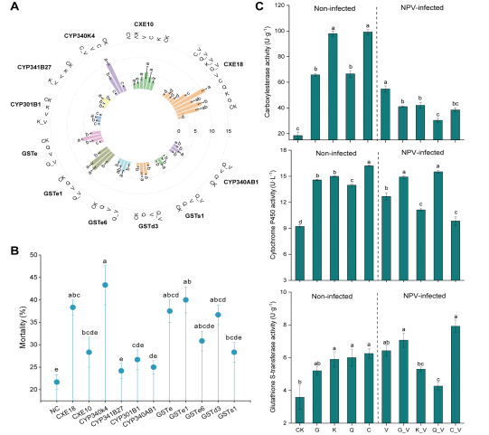 针对目前此领域的研究空白,团队首先测试了14种(隶属10科13属)寄主植物调控甜菜夜蛾对病毒杀虫剂(核型多角体病毒)的易感性,经比较发现:发现黄豆介导下该虫对病毒杀虫剂的易感性最强而蕹菜的最弱,甘蓝介导的易感性适中。根据这种生态学现象,团队选取3种寄主植物(黄豆、甘蓝、蕹菜)并对其叶片进行广靶代谢组学分析,结果显示:差异富集通路中的4种次生代谢物(染料木素、山奈酚、槲皮苷和香豆素)在黄豆叶片中的含量显著高于蕹菜和甘蓝叶片的(图1)。生测结果表明:植物叶片中较高含量的染料木素、山奈酚、槲皮苷和香豆素是导致甜菜夜蛾感染病毒后死亡率升高的重要因素;不同含量的4种次生代谢物和病毒组合处理,均能显著提高病毒杀虫剂对甜菜夜蛾的致死率。随后,采用转录组学分析了植物次生代谢物胁迫下感染病毒的甜菜夜蛾解毒酶基因表达的响应模式,发现:相对于单独病毒处理组,次生代谢物与病毒共同处理组的幼虫解毒酶基因显著下调、酶活性被不同程度抑制(图2)。紧接着,利用RNAi和转基因技术对这些下调基因进行功能验证,最终发现4个解毒酶基因(CYP340K4、CXE18、GSTe和GSTe1)的下调显著增加了幼虫对病毒的易感性(图3);同时,在处理后某些时间点,沉默GSTe、CXE18基因,抑制了次生代谢物单独处理组或次生代谢物与病毒联合组合处理组的血淋巴黑化率以及酚氧化酶活性;沉默CYP340K4、GSTd3基因,增加了香豆素(或槲皮苷)与病毒联合处理组的细胞凋亡率和caspase(Casp-1, 5)活性(图4)。该研究表明,感染病毒的甜菜夜蛾解毒酶基因表达降低,可能导致宿主免疫的改变,进而影响宿主夜蛾对病毒的易感性。该研究结果为植物次生代谢产物如何在植食性昆虫与昆虫病原体互作中发挥调控作用,提供了新的见解;同时,也为从植物中如何挖掘天然产物提升昆虫病毒杀虫剂的杀虫效果,提供了新的思路。该研究是国际上首次利用分子手段揭示“植物多样性如何影响病毒杀虫剂杀虫效果”这一生态现象的成功案例,该文的思路有望应用于从微观层面解析植物-害虫-天敌(天敌昆虫/昆虫病原微生物/杀虫剂)三者互作关系。