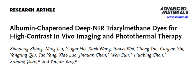 近日,我校药学院钱旭红院士、杨有军教授团队设计并两步合成具有“螺旋桨构型”的深近红外三芳基甲烷衍生物(EA5系列染料)。利用生物内源性白蛋白对EA5染料进行包封极大地提高了染料的荧光亮度,并解决了大多数近红外染料面临的合成步骤冗长、生物兼容性差、热力学稳定性差和水溶性差的难题。相关成果以“Albumin-ChaperonedDeep-NIR Triarylmethane Dyes for High-Contrast In Vivo Imaging and Photothermal Therapy”为题发表在Advanced Materials(Adv. Mater.2024, 2411515)上。