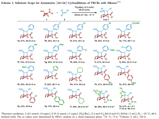针对上述挑战,团队基于对扩展BCBs的新反应性的兴趣,在前期的工作基础(JACS, 2024, 146, 18565; OL, 2024, 26, 1745)上,同时结合乙烯基环丙烷在钯催化环加成反应的文献报道,设计合成了烯基双环[1.1.0]丁烷(VBCB),并应用于钯催化的[2s+2p]环加成反应,实现了双环[2.1.1]己烷骨架的多样性合成 (Figure 1C)。进一步采用手性Trost配体成功实现了钯催化的VBCB与硝基烯烃的不对称[2s+2p]环加成反应,以高非对映选择性和对映选择性合成了具有两个相邻手性中心的多取代双环[2.1.1]己烷。(Scheme 3)