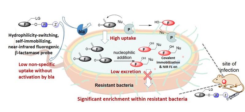 β-内酰胺酶在细菌中的表达是导致β-内酰胺抗生素耐药的主要原因,但同时也为在活体动物中监测细菌感染提供了独特机会。然而,由于动物活体本身是一个高度复杂、动态的环境,基于荧光探针对活体动物耐药细菌感染进行高质量成像仍然面临着诸多挑战。在本研究中,科研团队在前期亚甲基苯醌自锚定探针设计策略基础上(Chem. Sci. 2020, 11, 5889;Anal. Chem., 2020, 92, 15017;Angew. Chem. Int. Ed. 2024, 63, e202317773),发展出酶促多效应的β-内酰胺酶近红外荧光探针。该探针可以在β-内酰胺酶选择性促发下同时实现亲水-亲脂、共价键锚定、荧光开启等多重变化,使被酶激活的荧光分子高效富集在耐药菌中,从而实现在活体中对耐药细菌感染进行高质量、长时效荧光成像。相关研究对活体实时监测耐药细菌感染以及活体抗菌药物活性评估均具有重要价值。药学院博士研究生陈方方、博士后李玉姚为该论文共同第一作者,谢贺新为论文唯一通讯作者。