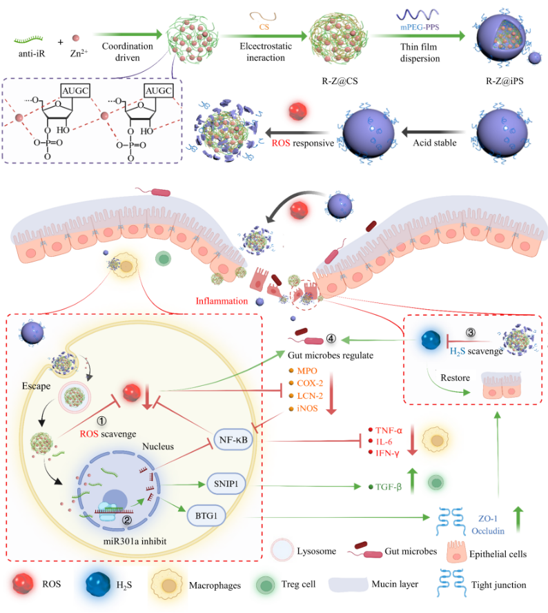 近日,华东理工大学药学院高峰教授课题组又有新突破,首次提出一种能有效调控炎症结肠部位ROS和H2S等自由基水平的反义寡核苷酸和锌配位的纳米酶。同时,本研究在前期金属基配位靶向纳米递药平台设计策略,配位机制和构建研究的基础上(Asian J. Pharm. Sci.,2024,19,100858;Adv. Healthc. Mater.,2024,2024,2401869;ACS Appl. Mater. Interfaces,2025,17,617),首次将上述锌基配位纳米酶,联合壳聚糖和PEG修饰的聚丙烯硫醚[PEG-poly(propylenesulfide),PEG-PPS]组成的ROS响应杂合脂质纳米递药平台,用于同时实现anti-miR-301a的口服递送,自由基-炎症通路调节,肠道屏障和菌群恢复等多重功能,从而实现IBD的有效治疗。相关研究对反义寡核苷酸的口服递送以及IBD的微环境调控均具有重要价值。相关成果以“An anti-miR-301a and zinc coordination driven nanozyme loaded in nanoparticle for oral therapy of inflammatory bowel disease based on colitis microenvironment regulation”为题发表在国际权威学术期刊Chemical Engineering Journal上。药学院博士研究生邹佳峰、硕士研究生夏传河为该论文共同第一作者,高峰为论文通讯作者。