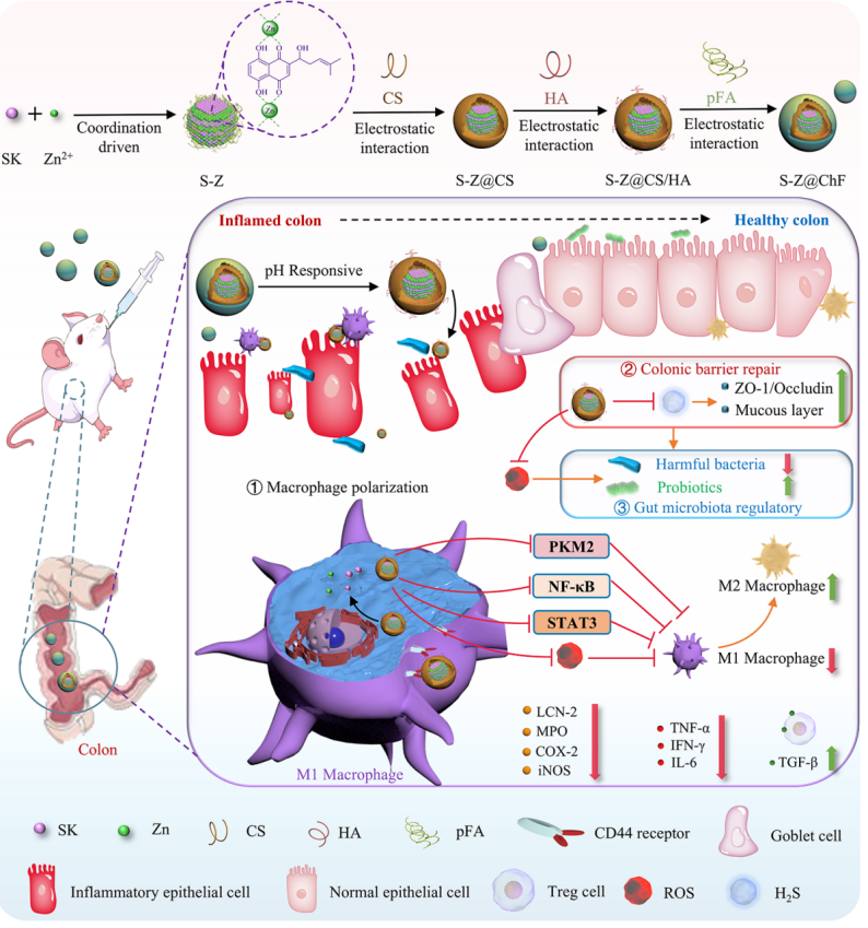 图2 基于紫草素和锌配位的口服pH响应纳米递药平台调控炎症肠道微环境示意图