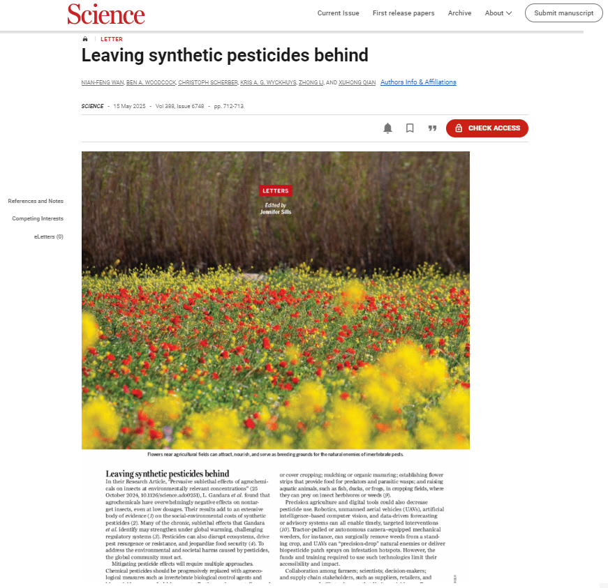 近日,我校钱旭红院士团队的万年峰教授联合华东师范大学等中英德澳的科研人员,在国际顶尖综合性期刊Science上以Letter形式发表了题为“Leaving synthetic pesticides behind”的学术论文。