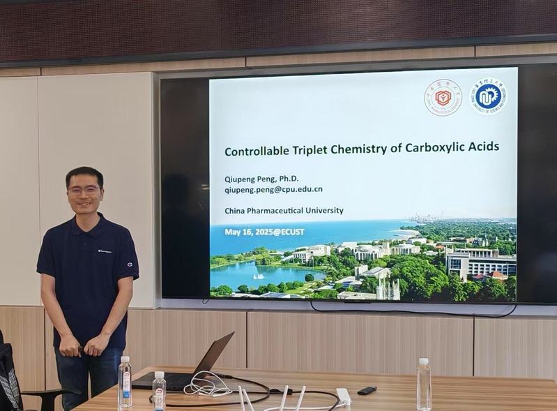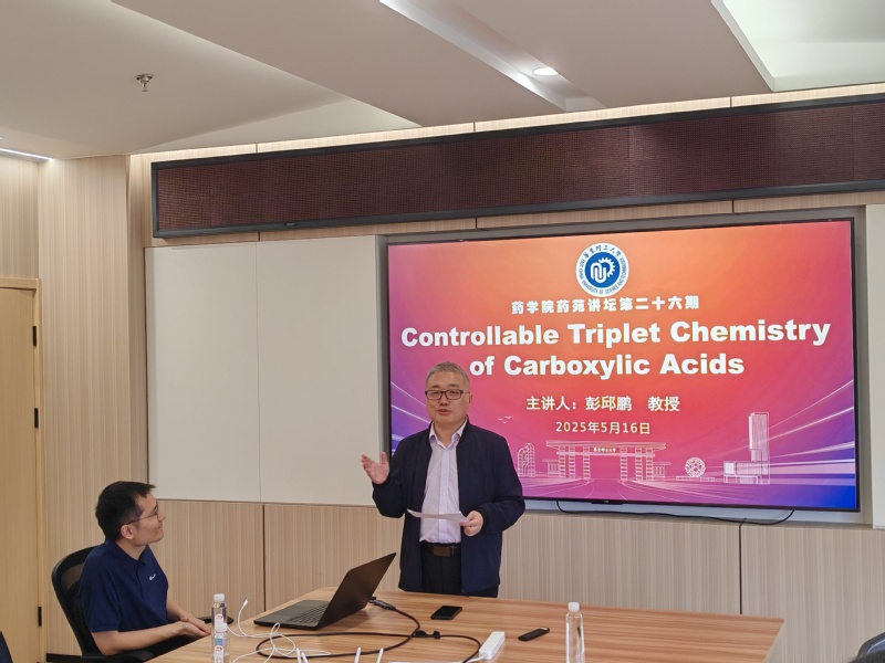 5月16日下午,药学院第二十六期“药苑讲坛”在实验十八楼418会议室举行,本期讲坛邀请到了我院校友、中国药科大学彭邱鹏教授,为师生们带来了一场题为《Controllable Triplet Chemistry of Carboxylic Acids》的学术报告。报告会由药学院副院长马磊主持,制药工程系副主任郑军等学院相关研究领域的师生参加。