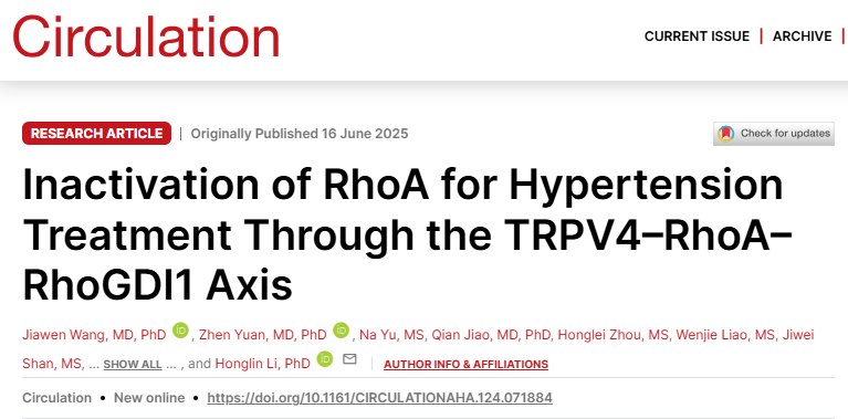 近日,我校药学院李洪林/王蕊教授团队在Circulation上发表了题为“Inactivation of RhoA for Hypertension Treatment Through the TRPV4-RhoA-RhoGDI1 Axis”的研究论文。该研究首次揭示了一种全新降压靶点——TRPV4-RhoA-RhoGDI1轴,并成功发现该靶点的首个小分子候选药物。