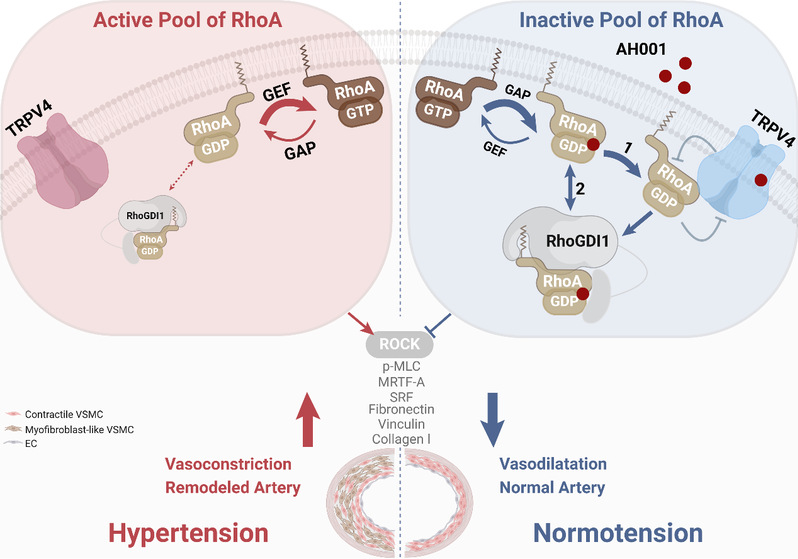 血压稳定的核心在于血管的“张弛有度”,这离不开血管平滑肌细胞(Vascular smooth muscle cell, VSMC)的精细调控。其中,瞬时受体电位香草酸4型通道(Transient receptor potential vanilloid 4, TRPV4)是一种广泛分布于动脉壁的非选择性阳离子通道,通过调控钙离子流动直接影响血管舒缩功能,在维持血压稳态中发挥关键作用。最新研究发现,Ras同源蛋白A(Ras homolog family member A, RhoA)可直接结合于TRPV4的ARD区域,将其锁定在关闭状态。然而,TRPV4-RhoA复合物在血管功能及高血压发生发展中的具体调控机制尚不明确。深入解析高血压状态下TRPV4-RhoA的相互作用模式及其动态调控规律,有望解锁新一代精准降压疗法的关键密码。