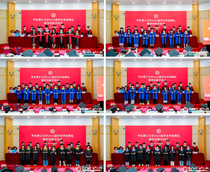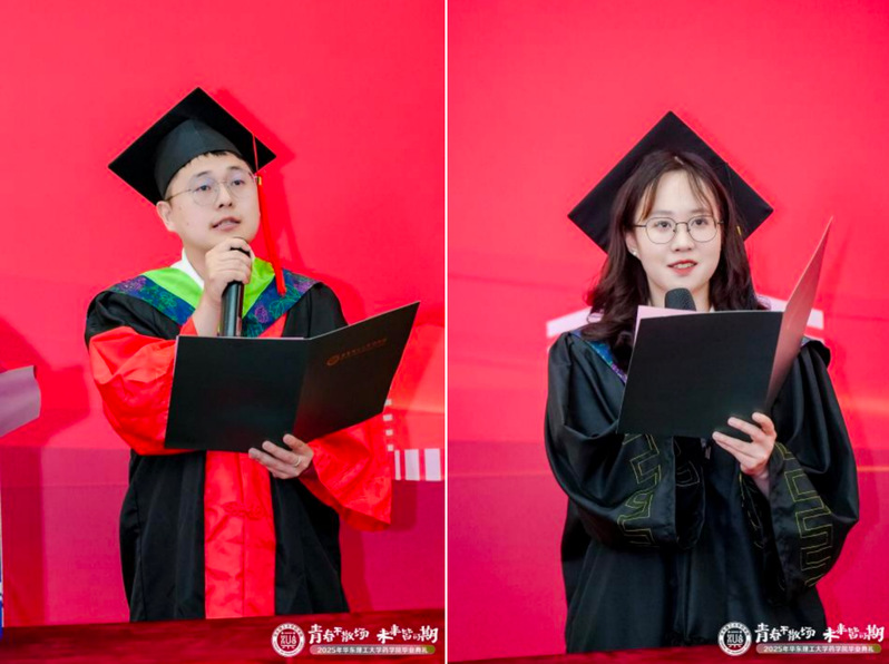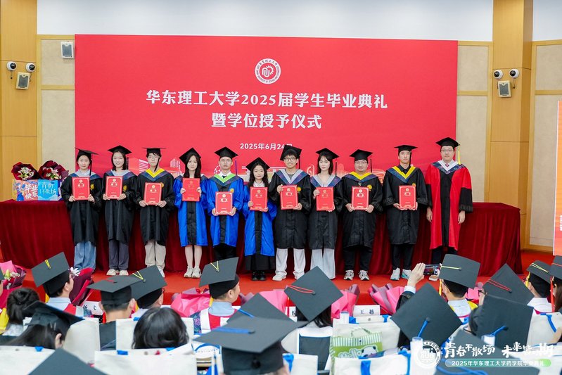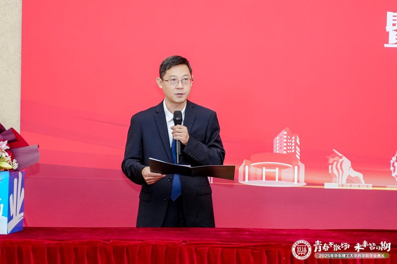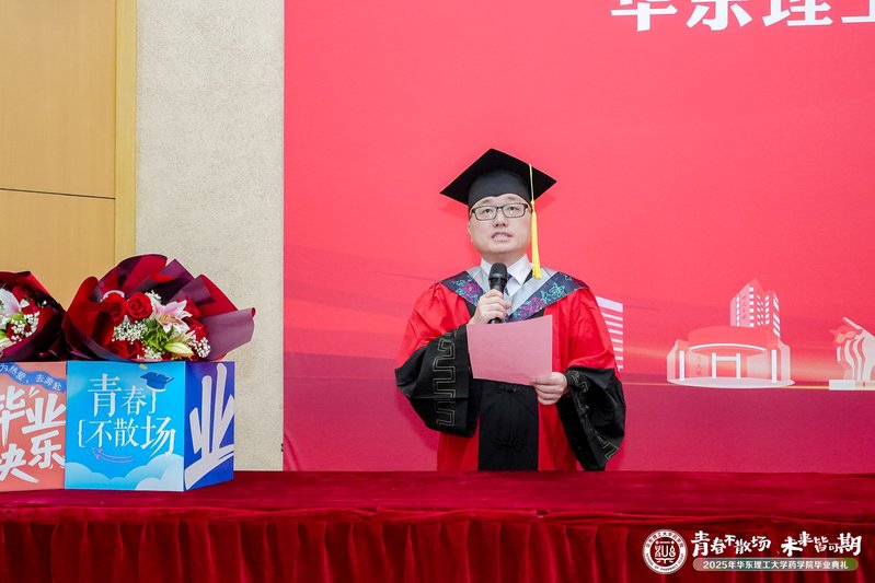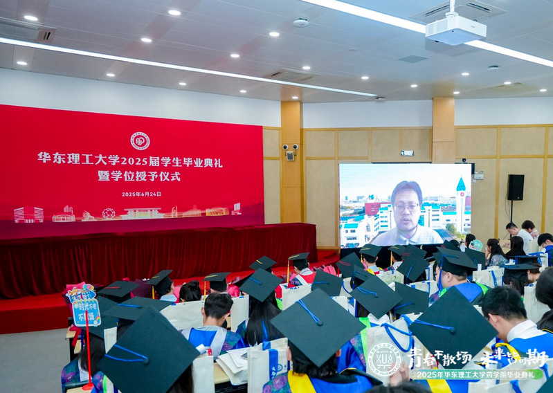 6月24日,华东理工大学药学院2025届学生毕业典礼暨学位授予仪式在徐汇校区七大教室举行。华东理工大学党委常委、副校长赵黎明,药学院党委书记倪炜,院长赵玉政,副院长马磊、张敏,药学院学术分委员会委员杨弋、唐赟、郑军,制药工程系主任齐明辉,辅导员、班导师等教师代表出席典礼。毕业典礼由药学院党委副书记王越主持。