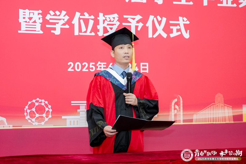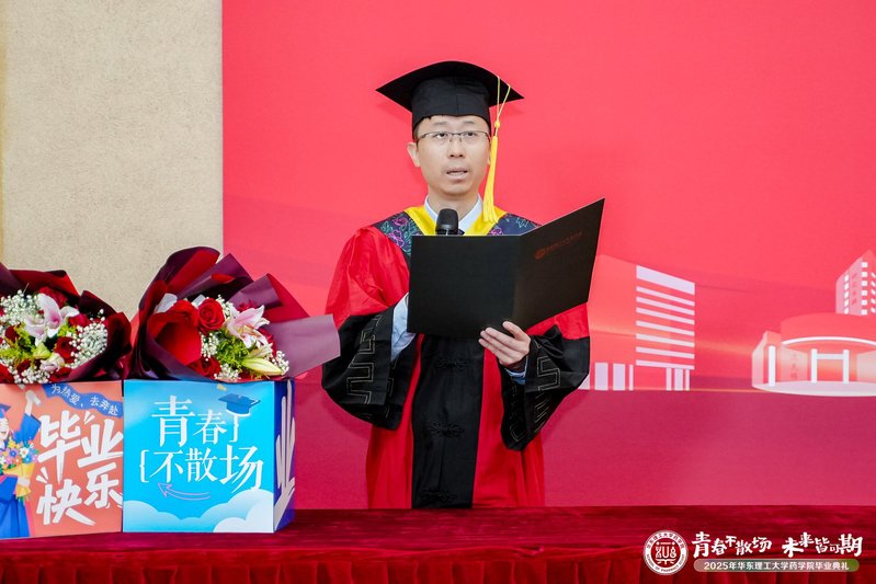 马磊宣读药学院2025届优秀毕业生表彰决定,鼓励全体同学汲取榜样力量,在未来征程中继续奋发有为。