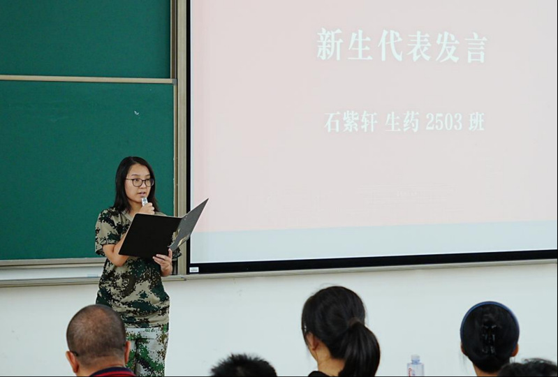 药学院2025级生药试验专业本科生石紫轩同学,作为新生代表发言。她表示,希望能在大学期间探索医药奥秘、锤炼实践能力,以“勤奋求实,励志明德”的校训为指引,扎实钻研专业知识、立牢报国之志;以“良药苦口、忠言逆耳”的院训为准则,始终虚心求学、精进本领,努力把个人奋斗融入国家医药行业发展浪潮,为守护人类健康贡献青春力量。