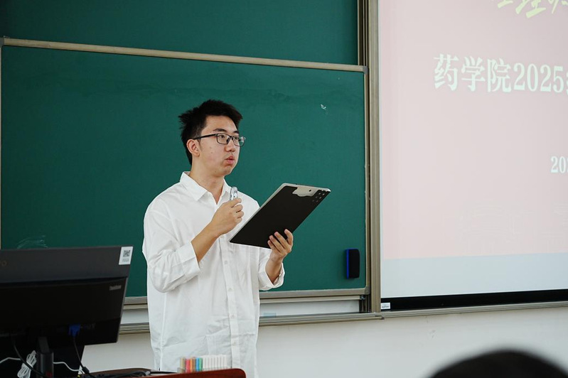 张敏以《纳忠言,造良药》为主题作学院发展介绍。他向新生们介绍了药学院的发展沿革、师资力量、科研成果等相关情况,勉励新同学们在未来学习中,既要扎实掌握专业知识,也要主动拓展跨学科视野,通过参与实践项目、学术交流等途径,全面提升科研创新、实践应用与团队协作能力,努力向复合型、创新型、应用型人才方向迈进。