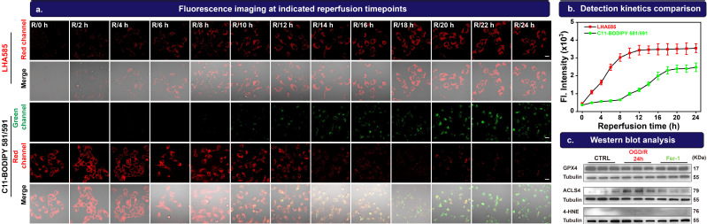研究团队系统验证了LHA探针的优异性能:(一)高灵敏度与特异性:LHA系列探针能特异性响应与脂质过氧化相关的多种高活性氧自由基(ROO·,RO·,HO·等)而对H₂O₂、ClO⁻等无明显反应。(二)良好的光稳定性与生物相容性:探针本身无背景荧光,且对光照稳定,适合长时间活细胞成像。(三)卓越的早期检测能力:在HT22细胞的氧糖剥夺/再灌注模型中,LHA585在再灌注初期即产生荧光信号,比现行金标准探针C11-BODIPY 581/591提前约8小时检测到铁死亡的发生。(四)活体成像可行性:进一步开发的近红外二区探针LHA930,成功应用于对乙酰氨基酚(APAP)诱导的小鼠药物性肝损伤模型,通过尾静脉注射后,在肝脏部位观察到显著的荧光增强,且该信号可被铁死亡抑制剂Fer-1有效抑制,证实了铁死亡在此肝损伤过程中的关键作用。