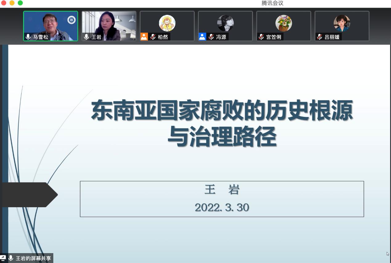 2022年3月30日,吉林大学行政学院“政午同行”青年教师学术沙龙第8期活动以线上交流会形式召开。本次沙龙由行政学院国际政治系王岩老师作为引谈嘉宾,围绕“东南亚国家腐败的历史根源与治理路径”的主题进行讲演。行政学院国际政治系宫笠俐教授、姚璐教授、许宁老师,公共外交学院乔蕊老师、陈曦老师,行政学院师资人才办公室孙久舒老师及学院部分研究生参与交流,沙龙由行政学院副院长马雪松教授主持。