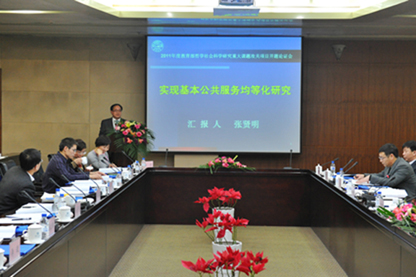 2011年12月17日下午14时30分,由吉林大学行政学院副院长张贤明教授主持承担的2011年度教育部哲学社会科学研究重大课题攻关项目“实现基本公共服务均等化研究”开题论证会在吉林大学东荣大厦第一会议室召开。教育部社会科学司张东刚副司长、成果处马建通处长,吉林大学党委常务副书记、副校长王胜今教授参加了开题会。教育部社科委员、北京大学政府管理学院王浦劬教授,教育部社科委员、东北大学副校长娄成武教授,教育部社科委员、北京大学政府管理学院副院长徐湘林教授,黑龙江大学副校长何颖教授,东北师范大学政法学院院长柏维春教授组成专家评审组。吉林大学社科处、行政学院、东北亚研究院、经济学院等相关部门主管领导、全体课题组成员以及部分青年教师等30余人参加了会议。
