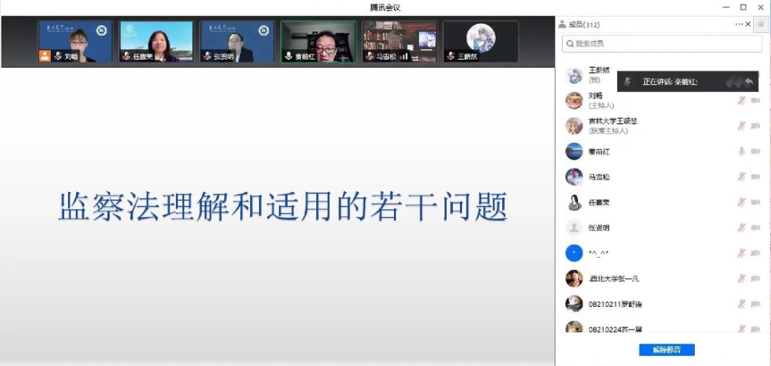 2022年5月14日,由吉林大学廉政研究院、吉林大学行政学院主办的清晏廉政名家讲坛第9期学术活动在腾讯会议平台举行。武汉大学法学院教授、博士生导师、教育部长江学者特聘教授、《法学评论》主编、中国法学期刊学会副会长、湖北省立法研究会会长秦前红教授受邀担任主讲专家,作题为“监察法理解和适用的若干问题”的学术讲座。吉林大学廉政研究与教育中心副主任刘畅教授主持讲座,吉林大学、中山大学、武汉大学等国内部分高校师生共三百余人参与本次学术活动。