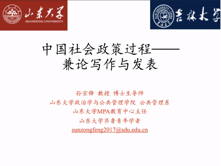 2022915日,吉林大学行政学院为公论坛第40期暨研究水平和论文质量提升计划第1讲线上学术讲座在腾讯会议平台举行。山东大学MPA教育中心主任、山东大学齐鲁青年学者、首届夏书章公共管理优秀博士论文获奖者、山东大学政治学与公共管理学院孙宗锋教授受邀担任主讲嘉宾,进行了题为“中国社会政策过程——兼论写作与发表”的学术讲演。本次讲座由吉林大学行政学院公共管理系主任董伟玮副教授主持,吉林大学行政学院及国内部分高校教师和学生共100余人参与本次活动。