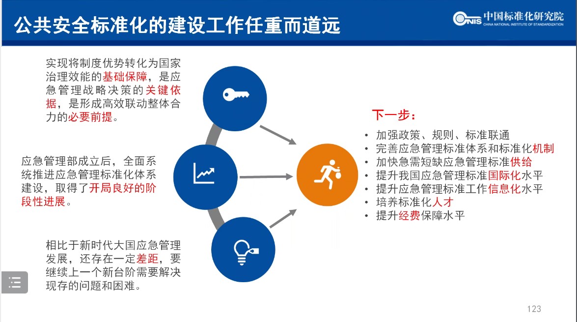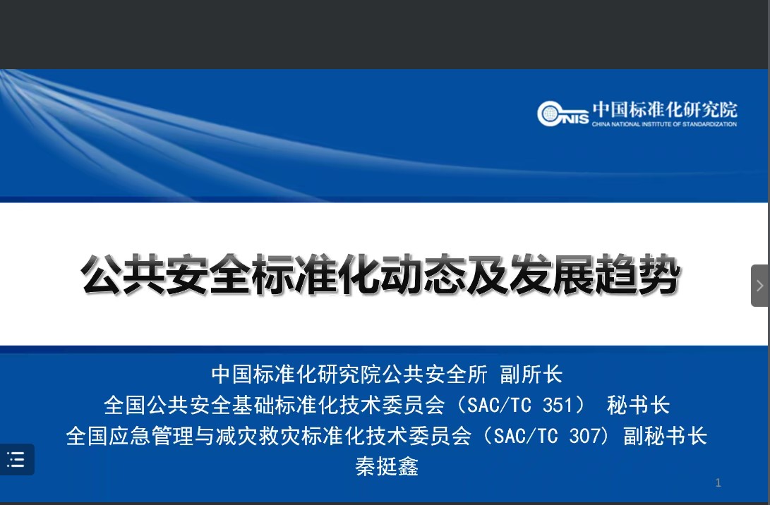 最后,秦挺鑫研究员总结,公共安全标准化工作任重而道远。虽然在应急管理部成立后,全面系统推进公共安全和应急管理标准化工作在总体上取得了阶段性进展,但是与新时代大国应急对标准化工作的要求相比,依然存在着一定的差距。因此秦挺鑫研究员提出,在未来,我国应该通过加强对政策、规则和标准联通问题的关注、进一步完善公共安全管理的标准化体系和标准化机制的构建以及增加急需短缺的应急管理标准的供给等手段,推进我国公共安全和应急管理标准化领域的进一步发展。