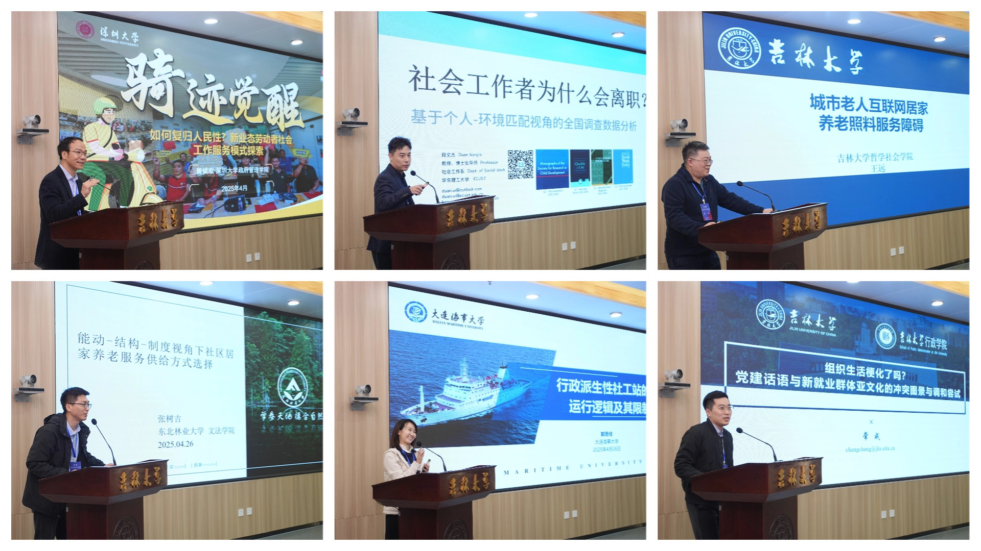 主题演讲四的主题为新时代社会工作的机遇与挑战,由吉林大学行政学院MPA教育中心副主任魏素豪副教授主持。深圳大学政府管理学院副院长黄斌欢副教授、华东理工大学社会与公共管理学院段文杰教授、吉林大学哲学社会学院王远教授、东北林业大学文法学院张树吉副教授、大连海事大学公共管理与人文艺术学院郭思佳副教授、吉林大学行政学院MPA教育中心副主任常成讲师分别以《如何复归人民性?新业态劳动者社会工作服务模式探索》《社会工作者为什么会离职?——基于个人—环境匹配视角的全国调查数据分析》《城市老人互联网居家养老照料服务障碍》《能动—结构—制度视角下社区居家养老服务供给方式选择》《行政派生性社工站的运行逻辑及其限制》《组织生活梗化了吗?党建话语与新就业群体亚文化的冲突图景与调和尝试》为题发表演讲。