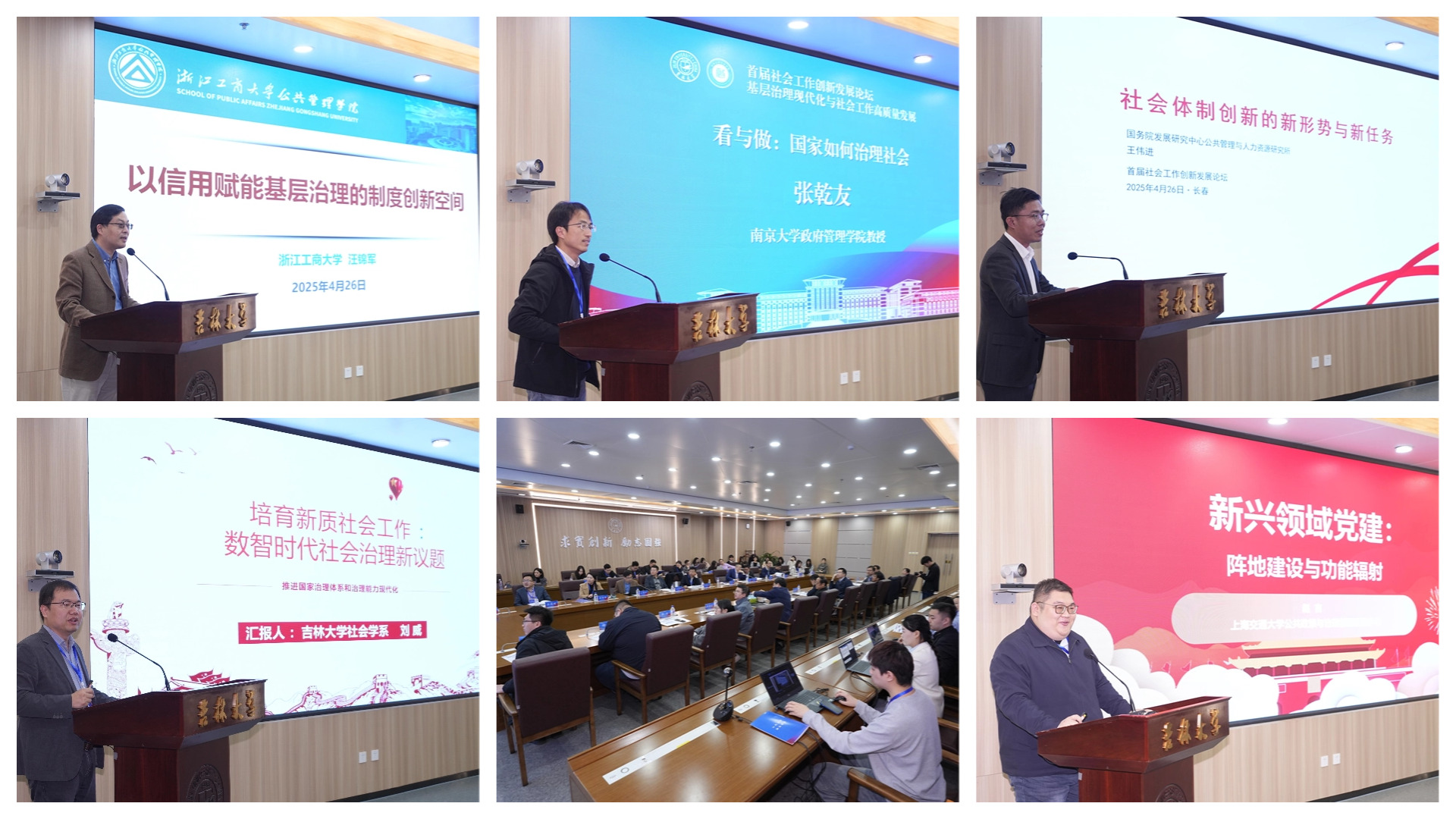 主题演讲二的主题为新时代社会治理的创新发展,由吉林大学行政学院MPA教育中心主任、公共管理系主任董伟玮副教授主持。浙江工商大学公共管理学院院长汪锦军教授、南京大学政府管理学院张乾友教授、国务院发展研究中心公共管理与人力资源研究所公共管理研究室主任王伟进研究员,吉林大学东北振兴发展研究院副院长、哲学社会学院刘威教授,“政治学人”负责人、上海交通大学国际与公共事务学院赵吉副教授分别以《以信用赋能基层治理的制度创新空间》《看与做:国家如何治理社会》《社会体制创新的新形势新任务》《培育新质社会工作:数智时代社会治理新议题》《新兴领域党建:阵地建设与功能辐射》为题发表演讲。