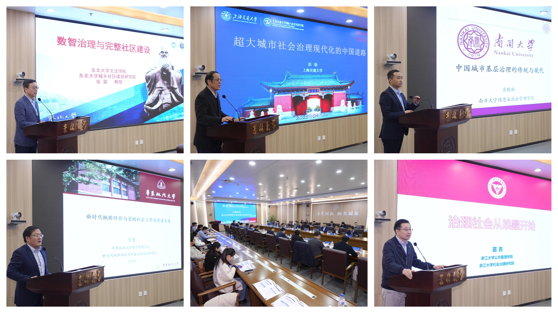 主题演讲一的主题为基层治理现代化的新变化新任务,由刘雪华主持。东北大学城乡社区建设研究院院长、文法学院张雷教授,上海交通大学国家安全研究院执行院长、国际与公共事务学院彭勃教授,南开大学周恩来政府管理学院院长吴晓林教授、华东政法大学政府管理学院院长任勇教授,浙大宁波理工学院商学院院长、浙江大学公共管理学院苗青教授,分别以《数智治理与完整社区建设》《超大城市社会治理现代化的中国道路》《中国城市基层治理的传统与现代》《新时代枫桥经验与党的社会工作高质量发展》《治理社会从唤醒开始》为题发表演讲。