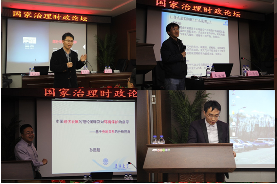论坛开始,主持人王立峰教授简要介绍了本期的受邀嘉宾的基本情况以及本次论坛的目的。王立峰教授指出本次论坛受邀嘉宾来自不同的学院,有不同的学术背景,这与论坛提倡跨学科交流的目的有关——不同研究背景的学者们之间思想的交流有助于论坛参与者开阔视野、更好的发现选题、切入选题。随后,三位嘉宾从自身研究背景出发,围绕环境治理问题,先后以“大气颗粒物与雾霾污染”“中国经济发展的理论阐释及对环境保护的启示”“雾霾治理的法律演进与政策迷思”为题作了主题发言。